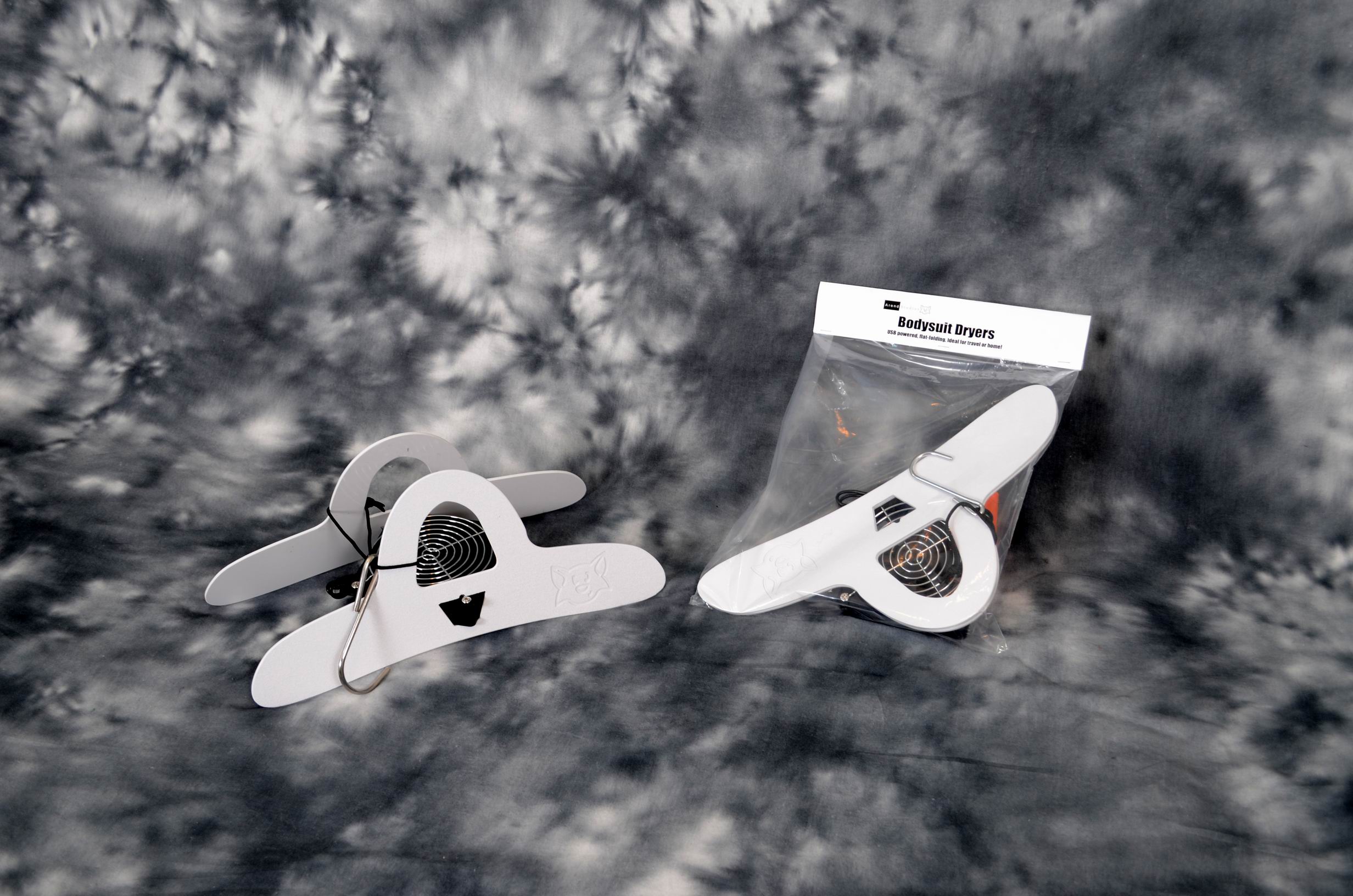 Contains our USB powered, flat-folding head and body dryers. Compact, easy to store. Powered by any USB wall charger or phone battery.